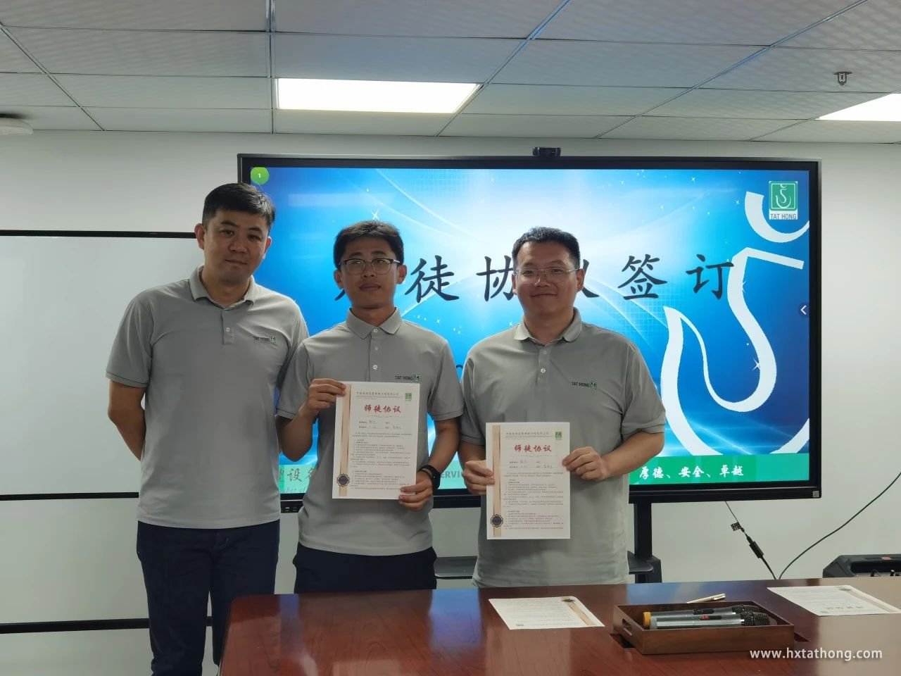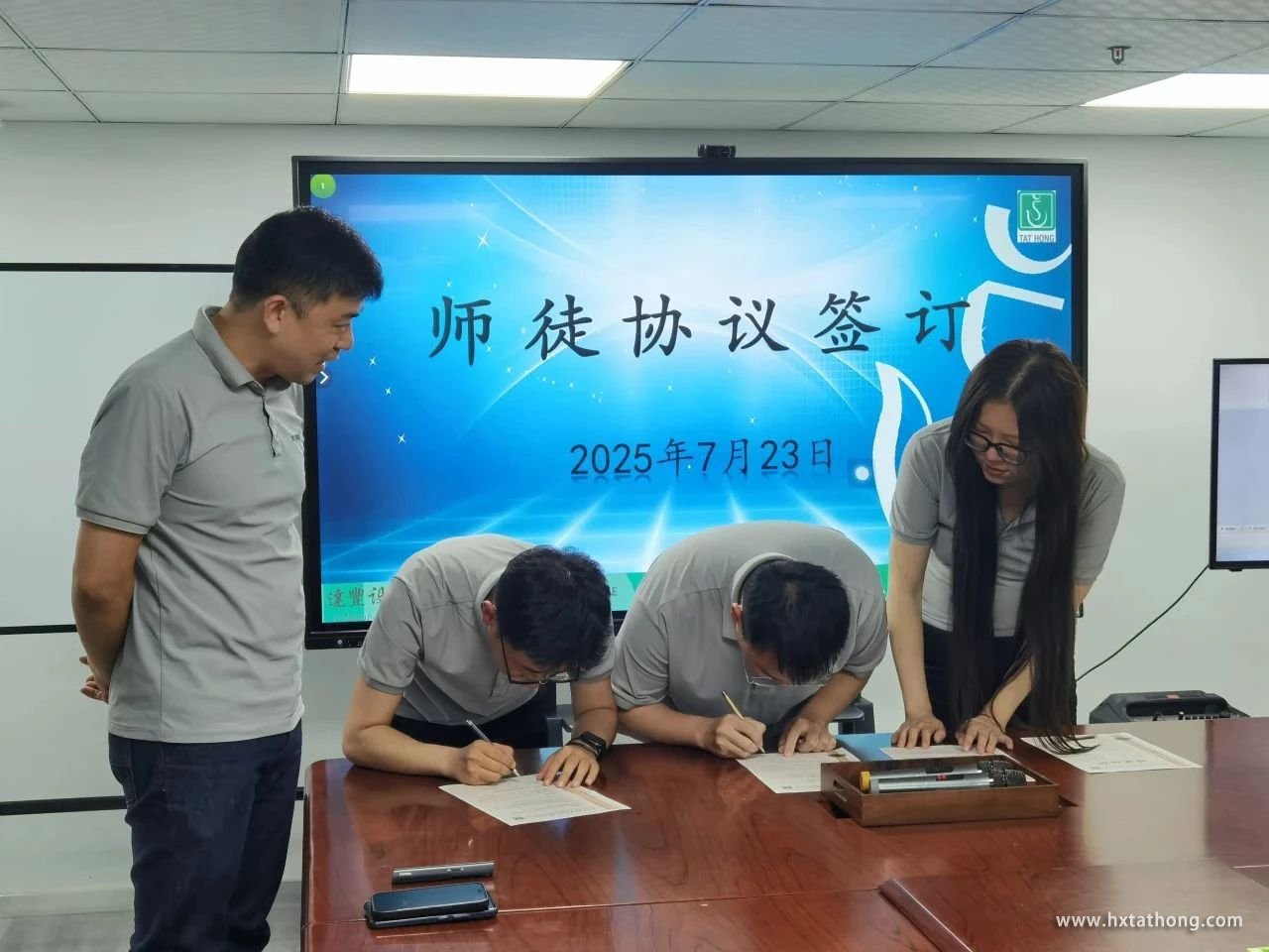 隨后,四對(duì)師徒逐一在“師帶徒手冊(cè)”和“師帶徒協(xié)議書(shū)”上鄭重簽下自己的名字。一份份協(xié)議,承載著沉甸甸的責(zé)任與期待,標(biāo)志著師徒關(guān)系正式確立。這不僅是一份簡(jiǎn)單的契約,更是一份承諾,一份傳承,一份共同成長(zhǎng)的約定。
